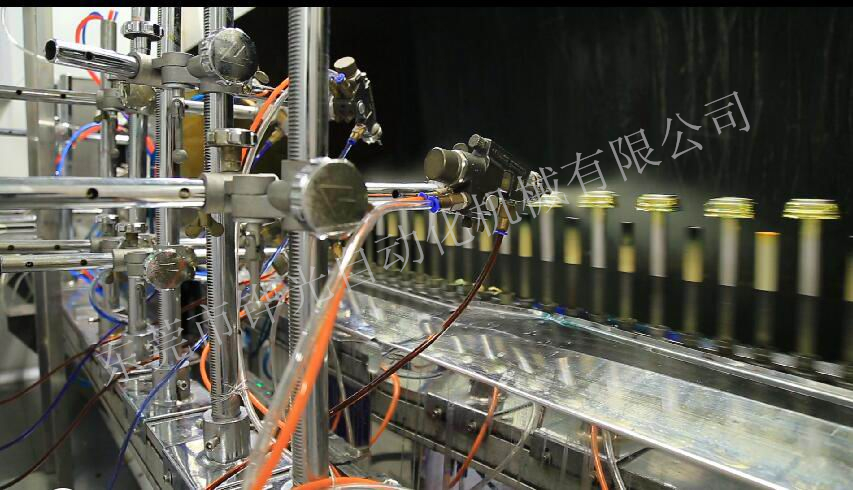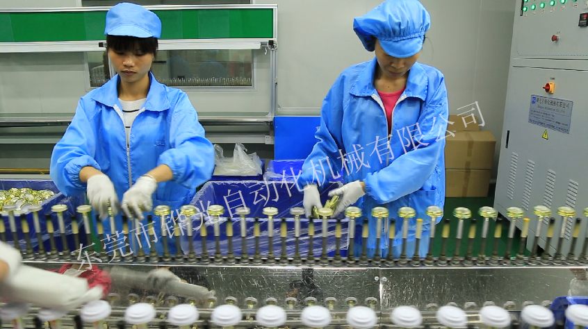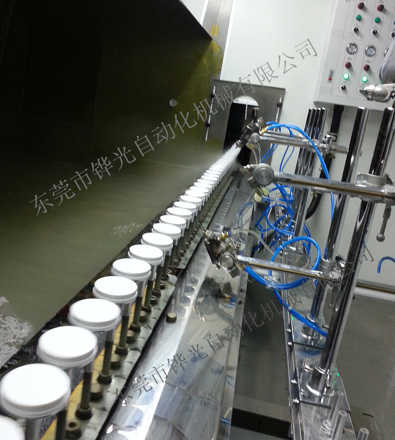 操作者在工作臺面的上料區手工將半成品瓶蓋,瓶子等工件套在夾具上,通過輸送傳動鏈依次通過生產線的各個功能部件。